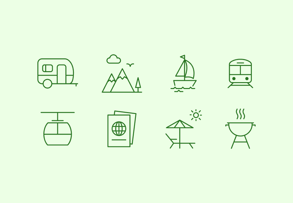 Angled presentation of a custom travel icon set. A single crisp green icon is highlighted in the center, surrounded by softly faded background icons.